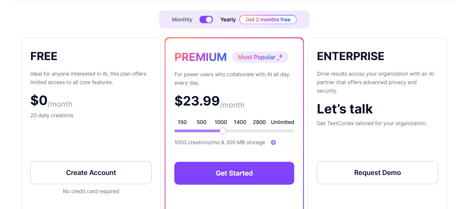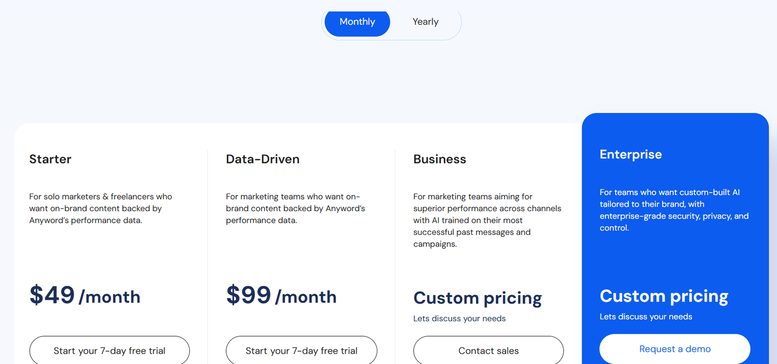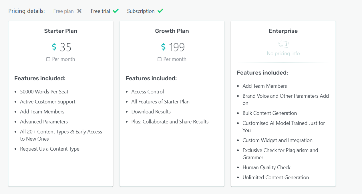 - Higher monthly pricing at $199 per month (varies by seats and word limits)