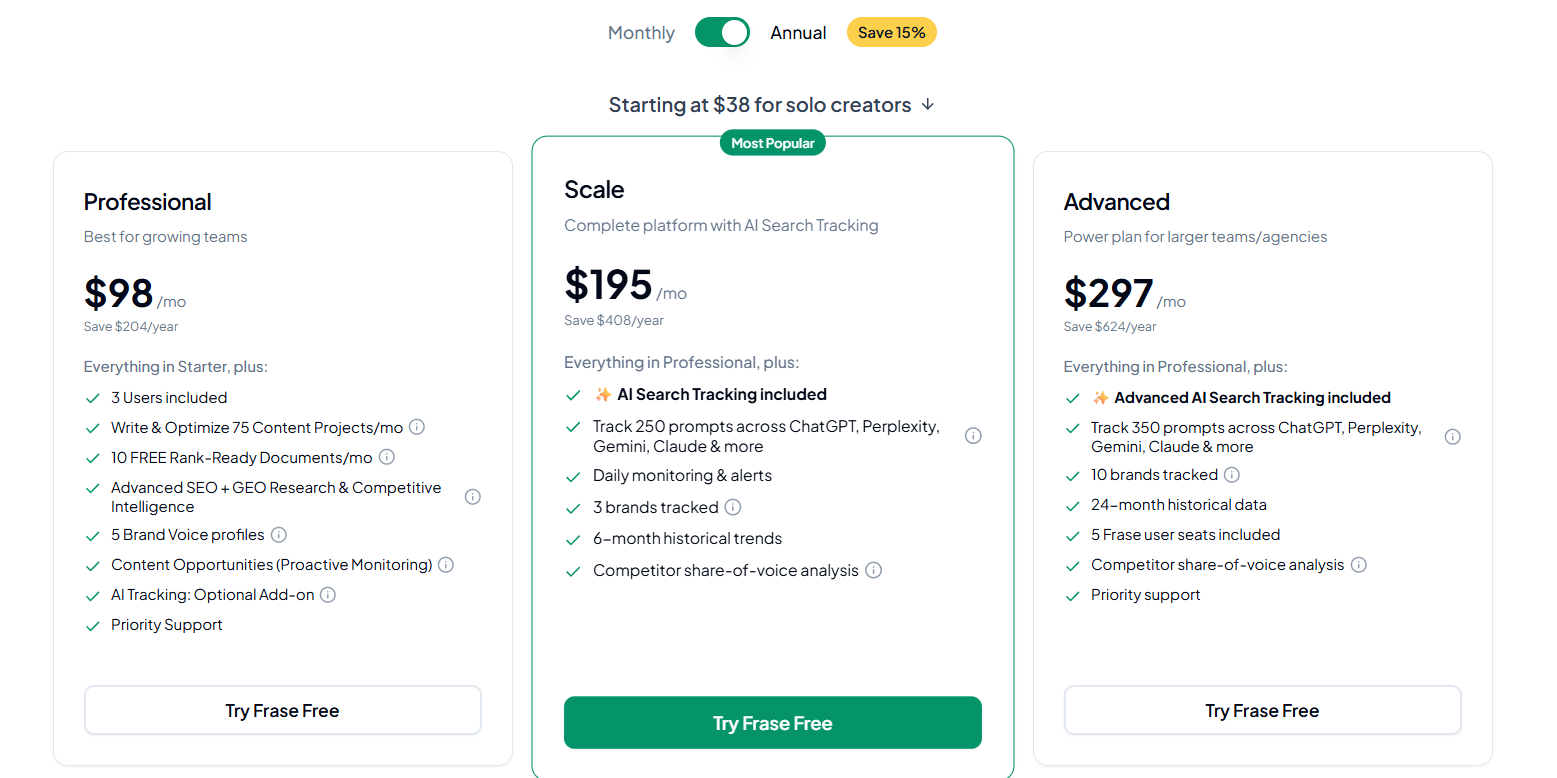 | Frase | Content refreshes tied to SEO research | Medium | Medium | Medium | Paid | No | 7.4 |